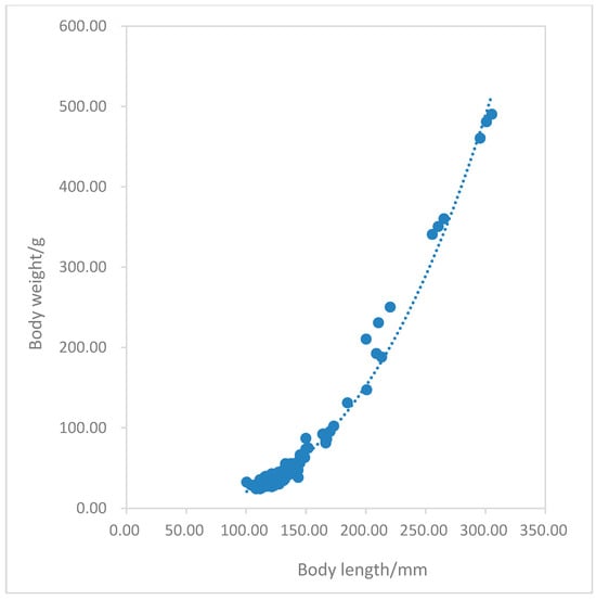 The relationship between body length and body mass was analyzed using power function regression as , where is the body mass, is the body length, and and are constants [,].