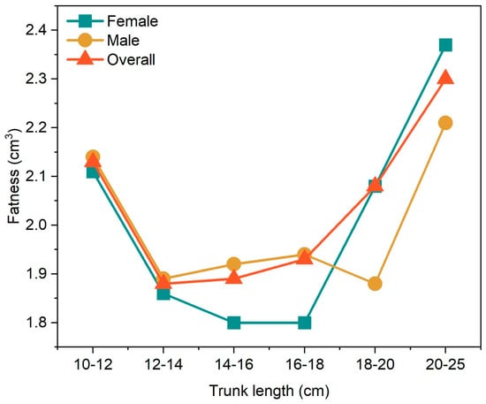To avoid the influence of individual differences on the experimental results, 6 samples with a body length of over 250 mm were excluded, and the condition factor of perch was studied at 2 cm intervals. The results showed that the condition factors of both female and male perch exceeded 1.80 g/cm3, and the maximum condition factor in each length interval was 2.37 g/cm3 (Figure 10). Overall, the condition factor of female perch was slightly higher than that of male P. fluviatilis.