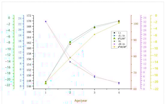 By differentiating the von Bertalanffy growth equation, the growth rate and acceleration equations of perch are obtained. The growth-related curves of P. fluviatilis are shown in Figure 11.