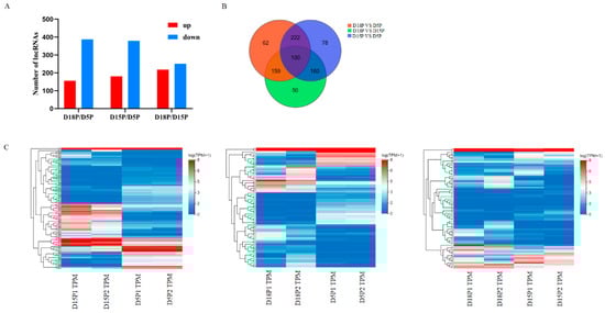Differential lncRNAs in exosomes isolated from the 5th day, 15th day, and 18th day of pregnancy. (A) Differential abundance of lncRNA in groups. (B) The Venn diagram shows the DELs. (C) Hierarchical clustering heatmaps of DELs.