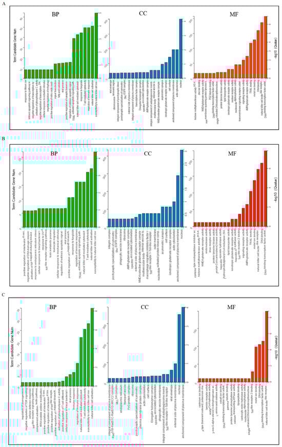 Gene ontology classifications of target genes of DELs in exosomes. (A) D5P vs. D15P; (B) D5P vs. D18P; (C) D15P vs. D18P. The X-axis represents enriched terms, the left Y-axis represents the number of enriched genes, and the right Y-axis represents the p-value. BP: biological process; CC: cellular component; MF: molecular function.