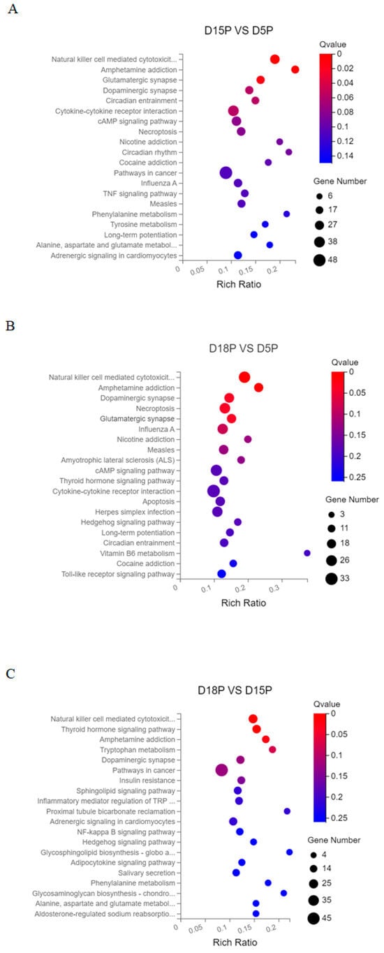 Using the KEGG database, signal pathway annotation of target genes of DELs was carried out in each group (only the top 20 are shown). “Natural killer cell mediated cytotoxicity”, “Amphetamine addiction”, and “Glutamatergic synapse” were the key signaling pathways in which the target genes of lncRNAs that changed between days 5 and 15 of gestation were expressed (Figure 3A). “Natural killer cell mediated cytotoxicity”, “Amphetamine addiction”, “Dopaminergic synapse”, “Necroptosis”, “Glutamatergic synapse”, and “Influenza A” were the primary complications between days 5 and 18 of pregnancy (Figure 3B). Target genes of differential lncRNAs were primarily involved in “Natural killer cell mediated cytotoxicity”, “Thyroid hormone signaling pathway”, “Amphetamine addiction”, and “Tryptophan metabolism” between 15 and 18 days of gestation (Figure 3C).