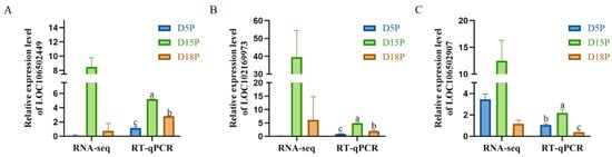 Three lncRNAs (LOC106502449, LOC102169973, LOC106502907) were randomly selected for RT-qPCR detection. The results were consistent with the sequencing data. Compared with D5P, the expression levels of LOC106502449 and LOC102169973 in exosomes of uterine flushing fluid were significantly up-regulated on D15P and D18P (Figure 4A,B, p < 0.05). Compared with the D5P group, the expression level of LOC106502907 was significantly increased in the D15P group but significantly decreased in the D18P group (Figure 4C, p < 0.05).
