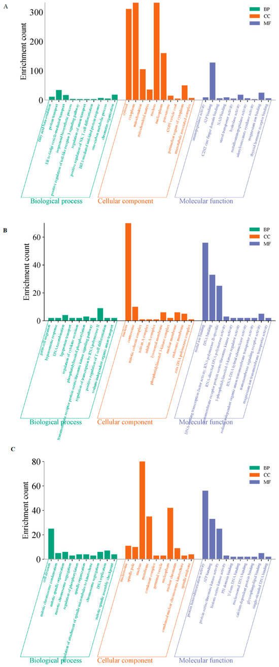 GO enrichment analyses of the three modules. (A) The blue-green module. (B) The brown module. (C) The yellow module. The X-axis represents enriched terms; the Y-axis represents the number of enriched genes. BP: biological process; CC: cellular component; MF: molecular function.