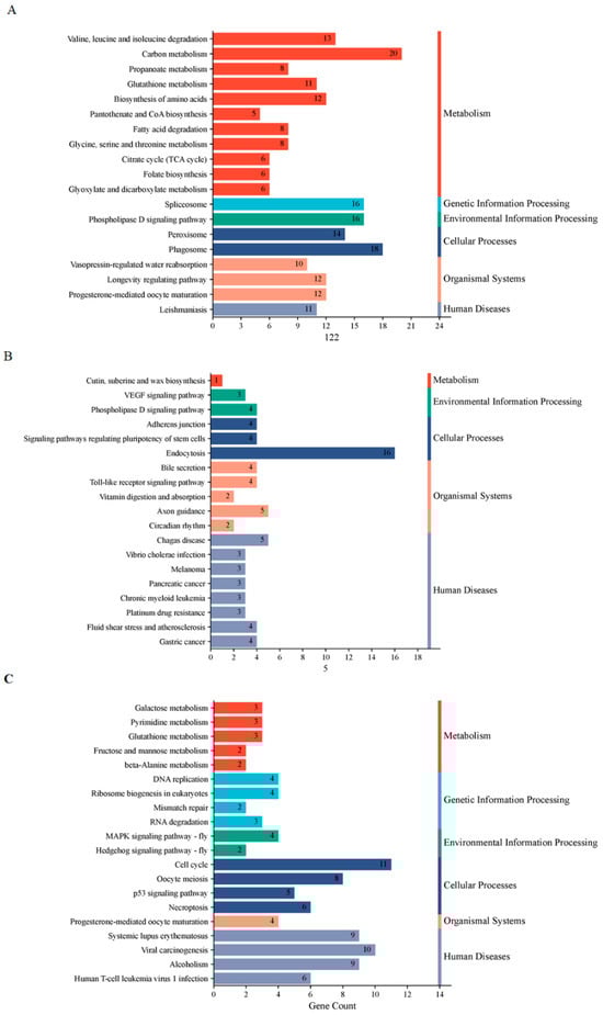For the KEGG pathway analysis, the most significantly enriched pathways at D5P included “carbon metabolism” and “phagosome” (Figure 7A). At D15P, key enriched pathways comprised “VEGF signaling pathway” and “endocytosis” among others (Figure 7B). By D18P, the enriched lncRNAs and mRNAs were mainly involved in “Cell cycle”, “Viral carcinogenesis” and “MAPK signaling pathway” (Figure 7C).