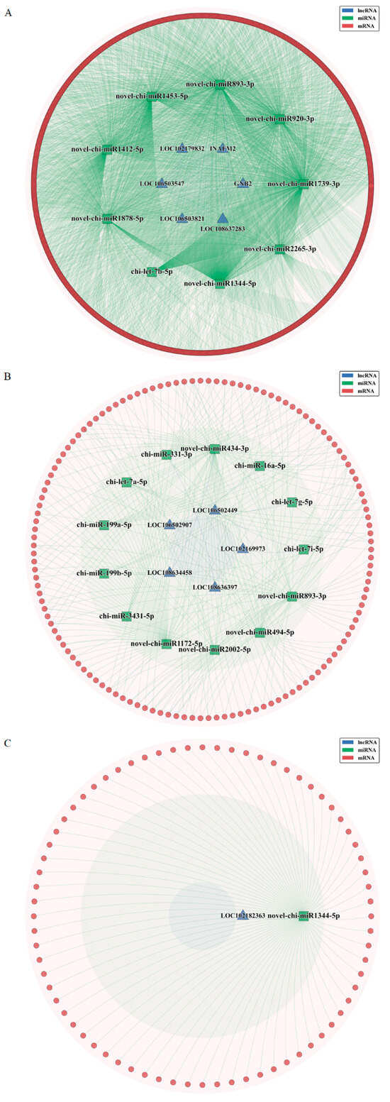 To construct the ceRNA network, we obtained the predictive interaction of DELs in the WGCNA modules with miRNAs by RNAhybrid (http://bibiserv.techfak.uni-bielefeld.de/rnahybrid) (accessed on 2 January 2025) []. Meanwhile, the interaction between DEMs and miRNAs were predicted by miRTarBase (http://mirtarbase.cuhk.edu.cn/) (accessed on 2 January 2025) [], miRanda (http://www.microrna.org/) (accessed on 2 January 2025) []. We screened the differentially expressed miRNAs with the opposite expression pattern of lncRNA and mRNA in the previous sequencing []. Then we constructed and visualized the lncRNA-miRNA-mRNA ceRNA network based on lncRNA-miRNA and miRNA-mRNA pairs using the Cytoscape software (version 3.7.0; Cytoscape Consortium, La Jolla, CA, USA).