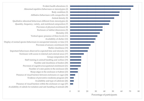 In addition, experts selected the 10 direct or indirect indicators they considered most important based on the validity criterion for Scenario One. As illustrated in Figure 2, evident health alterations, abnormal repetitive behaviours or stereotypies, body condition, and affiliative behaviours with conspecifics—all of which are animal-based—occupied the top four positions.