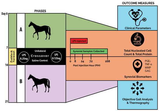 The study was conducted in 2 phases (A, B) using a unilateral crossover design, in which each horse received both doses of LPS over the study period. However, only a single dose was used during each phase (unilateral), and only one middle carpal joint (left or right) was injected with LPS at a time, with the contralateral joint serving as the control. In the 2nd phase of the study (B), the LPS was injected into the limb that served as control in phase A. The control used throughout both phases was 0.9% sodium chloride. An overview of the study design is shown in Figure 1.