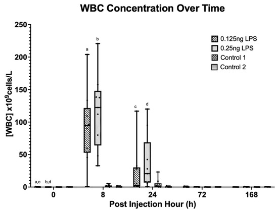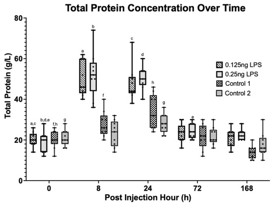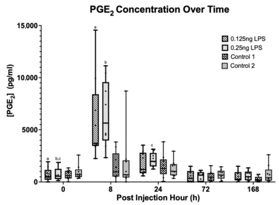 The aim of this study was to assess the effectiveness of lower LPS doses compared to what has been more commonly utilised in the earlier literature [1,2,3,8,14,15,26]. The results clearly show that both the 0.125 ng and 0.25 ng doses of LPS produce a comparable increase in TP and WBC with a peak at PIH 8. The TP had returned to baseline by PIH 72 in the 0.125 ng group and by PIH168 in the 0.25 ng group. The WBC quickly returned to baseline values in both groups by PIH 72. This pattern is also evident in the PGE2 values which follow a similar trend, peaking at PIH 8. However, whilst the 0.125 ng group returned to baseline by PIH 24, the 0.25 ng dose exhibited an increase above baseline that persisted through PIH 24 until PIH 72. The trends followed by TP, WBC and PGE2 are similar to those reported in other studies using similar LPS doses (0.25 ng to 0.5 ng), where peak values are achieved at PIH 8 [5,8,15].