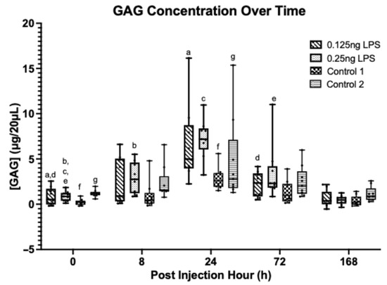Synovial fluid GAG over time between treatment groups. Where statistical significance between treatment groups exists, this is denoted by the respective p-value. Lower case letters denote statistically significant differences from baseline, a–c, e, f (p < 0.001), d (p = 0.011), g (p = 0.002).