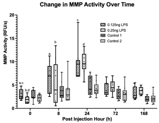 MMP activity [Figure 6] was statistically significantly increased from baseline at PIH 8 and PIH 24 in both the 0.125 ng (p = 0.008, <0.001)) and 0.25 ng doses (p < 0.001, p < 0.001). There were no statistically significant differences between either LPS dose at PIH 8 (p = 0.984) or PIH 24 (p = 1.00). At PIH 8 there was no significant difference between either control in the 0.125 ng group (p = 0.145, p = 0.245) but there was in the 0.25 ng group (p = 0.024, p = 0.049). However, at PIH 24 statistically significant differences did exist between both LPS doses and all controls (p < 0.001). All values had returned to baseline by PIH 72.