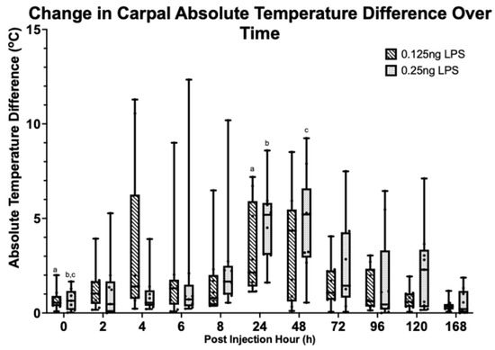 Change in absolute temperature difference (oC) over time between LPS treatment groups. Where statistical significance between treatment groups exists, this is denoted by the respective p-value. Lower case letters denote statistically significant differences from baseline, a (p = 0.019), b (p < 0.001), c (p = 0.002).