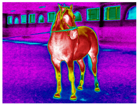 The performance of horses during exercise testing depends on disturbances in thermoregulation, especially in hot and humid environments [8,9] or in horses that are not acclimatized to the ambient temperature [9,10]. Therefore, skin temperature can serve as a useful indicator of acute thermoregulatory fluctuations, which can be effectively detected by infrared thermography (IRT) [11,12,13,14,15,16,17,18]. IRT has been used in veterinary medicine since the 1970s and complements conventional X-ray and ultrasound examinations [14,19,20]. Recent advances in equipment design and imaging technology have expanded the use of this device in the diagnosis, prognosis, and evaluation of a variety of pathologic conditions, including those related to musculoskeletal, inflammatory, and neurologic diseases [17,20,21,22]. Thermography has also been shown to be useful in assessing equine welfare and acute stress levels [23,24]. It has also been used to assess the performance of horses in various activities such as exercise, training, and competition [11,15,16,20,25]. A study on thoroughbreds in racing [15] showed a correlation between body surface temperature and blood lactate concentration, highlighting the potential of IRT in assessing adaptation to increased workload during race training.