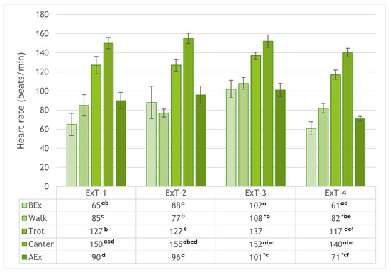 Heart rate (Figure 2) increased progressively (p < 0.001 between phases) during the transition from resting BEx to walk and from trot to canter in all Ex tests. Subsequently, heart rate decreased in all Ex tests at rest AEx (p < 0.001 compared to canter). When comparing horses within specific phases of the Ex test, HR values were higher in ExT-3 than in ExT-4 at walk and at rest AEx (p < 0.05). There were no differences (p > 0.05) in HR values between Ex tests 1 to 4 at rest BEx, trot, and canter. The HR values correlated negatively with air temperature (from R = −0.938 for trot to R = −0.572 for canter; p > 0.05) and positively with humidity (from R = −0.943 for trot to R = 0.622 for walk; p > 0.05).