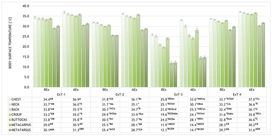 The body surface temperatures (BST) of selected regions (chest, neck, back, croup, buttocks, metacarpus, and metatarsus) before and after exercise (BEx and AEx). * p < 0.001 (for temperatures of the specific region within an ExT test BEx vs. AEx); A–D p < 0.001 (for temperatures of the specific region within the phases (BEx or AEx) of various exercise tests with the same label); # p < 0.001 (for metacarpus and metatarsus compared to all other regions BEx and AEx in ExT-1 and Ext-2; a–e p < 0.001 (for temperatures of different regions BEx within an Ex-T with the same label); o,r,x–z p < 0.001 (for temperatures of different regions AEx within an Ex-T with the same label).