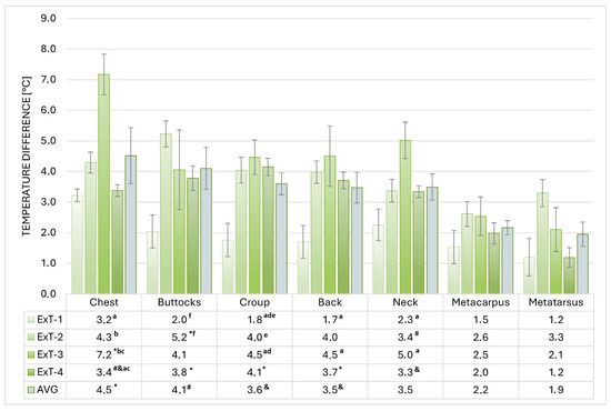Warming of selected regions in exercise tests 1 to 4 (ExT-1 to ExT-4). a–c p < 0.001; d,e p < 0.01; f p < 0.05 (for values within a column with the same label); * p < 0.001; # p < 0.01; & p < 0.05 (for marked values versus metacarpus and metatarsus within a row).