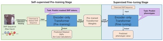This research addresses this methodological void by introducing a novel framework built upon the Transformer architecture, a deep learning model that has shown revolutionary success in natural language processing [13]. We posit that the self-attention mechanism at the core of the Transformer is uniquely suited to overcome the limitations of prior models by effectively capturing complex contextual relationships and long-range dependencies within sequential data, making it an ideal candidate for genomic analysis [14,15]. Furthermore, we leverage the power of self-supervised learning (SSL), a paradigm that enables models to learn rich, effective representations from genomic data itself, used in an unlabeled fashion [16,17]. This is particularly advantageous in genomics, where unlabeled SNP sequence data is abundant, while corresponding high-quality phenotype data is often scarce and expensive to acquire [16].