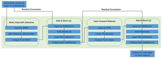 Detailed structure of a single Transformer encoder layer, illustrating the multi-head self-attention (MHSA) and feed-forward network (FFN) sub-layers with residual connections and layer normalization.