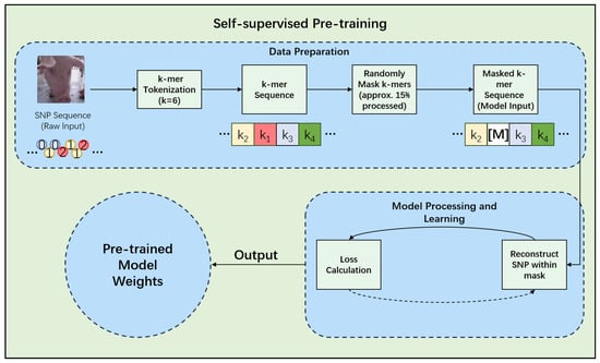 The self-supervised pre-training phase employs a masked 6-mer prediction (M6P) objective, a critical methodological shift from masking individual SNPs (Figure 3). This strategy is predicated on the biological principle that SNPs are often inherited in blocks (haplotypes). By tokenizing the genome into non-overlapping 6-mer sequences, the model is tasked with learning local haplotype patterns directly, which also significantly reduces the input sequence length for computational efficiency [15,17]. During this stage, 15% of the 6-mer tokens in each sequence are randomly selected for prediction. Of these, 80% are replaced with a special [MASK] token, 10% are replaced with a random 6-mer token from the vocabulary, and the remaining 10% are left unchanged [15]. This pre-training utilizes the complete genotypic datasets from both the PIC Genomic Dataset (PIC-GD) and the Huazhong Agricultural University—Piglet Mortality (HZA-PMB) at Birth (HZA-PMB) populations, without relying on any phenotype labels. This allows the model to learn a generalized understanding of swine genomic structure from diverse genetic backgrounds. The model is trained to predict the original 6-mer tokens at the masked positions using a cross-entropy loss function, with the AdamW optimizer and a learning rate schedule involving a warm-up and subsequent decay [13].