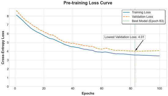 The model first underwent a self-supervised pre-training phase on the complete, unlabeled genomic data from both the PIC-GD and HZA-PMB datasets. The pre-training objective was Masked 6-mer Prediction [15]. As illustrated in Figure 4, the training and validation losses steadily decreased, reaching convergence on the validation set at 83 epochs with a final cross-entropy loss of 4.01. This indicates that the model successfully learned meaningful, underlying representations of genomic structure from the large-scale SNP sequences, establishing a robust foundation for the subsequent supervised fine-tuning tasks [11,15,16,17].