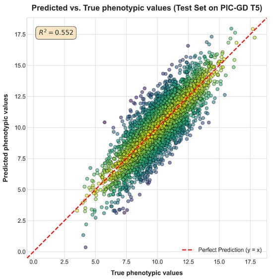 These results robustly demonstrate that (1) the Transformer architecture is inherently more capable of capturing complex genetic effects than linear models and other tested architectures [13,14], and (2) self-supervised pre-training is the critical step that unlocks this potential by providing a powerful initialization based on general genomic knowledge [15,16,18]. Figure 6 visually confirms the strong agreement between predicted and true phenotypic values (R2 = 0.552) for PIC-GD T5.