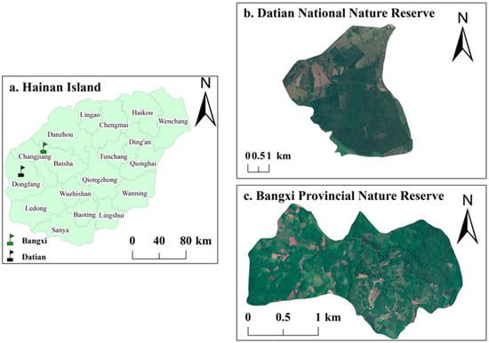 The study areas consisted of Datian Reserve and Bangxi Reserve (Figure 1). Datian Reserve (19°05′–17′ N, 108°47′–49′ E) is located in Dongfang City in the southwest of Hainan (Figure 1b) at an elevation of 30–80 m, with the reserve covering an area of 1310 ha []. Bangxi Reserve (19°22′–24′ N, 109°05′–06′ E) is located in Bangxi Town in the northwest of Baisha County (Figure 1c) at an elevation of 17–80 m, with the reserve covering an area of 361.8 ha []. Datian Reserve and Bangxi Reserve are both wildlife nature reserves, whose main purpose is to protect the Hainan Eld’s deer (Rucervus eldii) and its habitat. In addition to stable populations of the Chinese francolin, the two reserves also contain its close relative, the red junglefowl [].