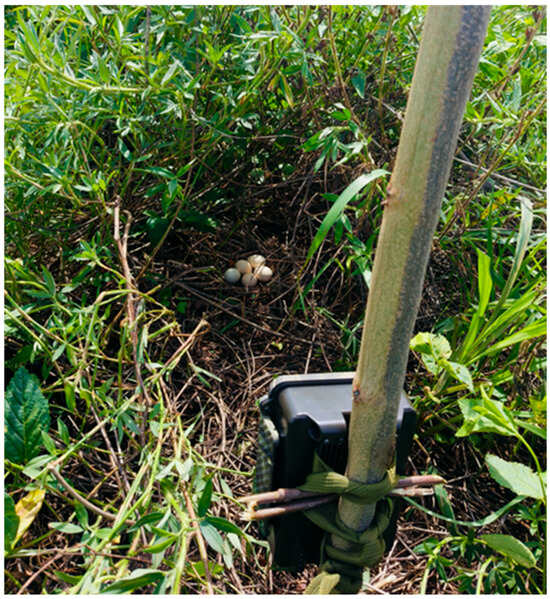 Birds of the family Phasianidae are sensitive to environmental changes, and can serve as indicator taxa reflecting the health of the local ecological environment to some extent [,,]. Compared to other birds, pheasants have a higher risk of endangerment []. Studies have shown that most Phasianidae species are ground-nesting [,], making them more vulnerable to disturbances. Recent reports have found that the pheasant survival rate in Hainan is becoming increasingly threatened due to human hunting activities and habitat destruction []. Basic reproduction data and nest predation information serve as important evidence for the formulation of species conservation strategies. However, the skittish behavior of pheasants and their cryptic nesting behavior have made it difficult to study their reproductive ecology, resulting in a relative dearth of relevant research. In fieldwork, camera traps offer advantages such as continuous monitoring and reduced disturbance to wildlife [,,]. This technology has also recently been applied to the reproduction-related research of pheasants, thus providing a new approach and data support for exploring pheasant reproductive ecology [,]. For example, Rao et al. (2017) employed infrared cameras to capture the special reproductive behaviors of the Hainan partridge (Arborophila ardens) []. Artificial nest experiments can minimize the human disturbance to natural nests and compensate for the inadequate sample sizes of field experiments [,,,]. For example, Rao et al. (2023) combined the use of infrared cameras and artificial nest experiments to explore the reproductive ecology and potential predators of the red junglefowl (Gallus gallus jabouillei) [].
