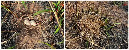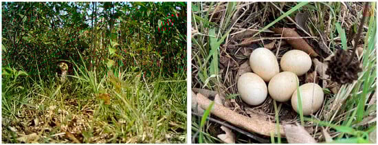 All natural nests found in this study were open-ground nests without dry leaves or branches covering the eggs (Figure 10B). The discovered nests were all located at the roots of dwarf shrubs and grasses. The nests were oval, shallow pits lined with soft shrubs and grasses, dead twigs, leaves, etc. (Figure 10). The number of natural nests was highest in May (8 nests, accounting for 36.36% of the total number), followed by August (6 nests, 27.27%), June (5 nests, 22.73%), and July (3 nests, 13.64%). The parameters of the eggs and nests in natural nests are shown in Table 2.