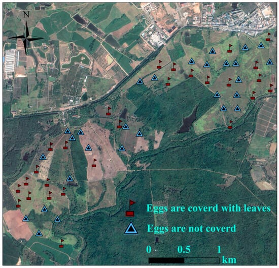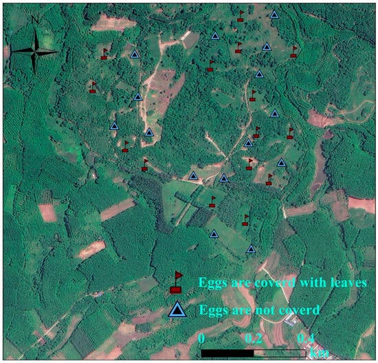 Artificial nest experiments were carried out in Datian Reserve (March–July 2023) and Bangxi Reserve (April–July 2023). Using leaves, twigs, and feathers as nesting materials, artificial nests were constructed by imitating the natural nests of the Chinese francolin, and placed within potential nesting sites []. Two unfertilized eggs of domesticated Chinese francolins that were similar in size and color to those of wild Chinese francolins were placed in each artificial nest (Figure 3). Based on whether the experimental eggs were covered with dry leaves, two groups of experiments were set up, namely, the “fully covered” and “non-covered” groups (Figure 3). A total of 55 artificial nests were placed in Datian Reserve, among which 27 were fully covered and 28 were non-covered (Figure 4). A total of 30 artificial nests were placed in Bangxi Reserve, among which 15 were fully covered and 15 were non-covered (Figure 5). In addition, infrared cameras were installed for some of the artificial nests to record the status of nest predation. The experimental period was 21 days, which was based on the natural incubation period of the species, during which a total of 2 examinations were carried out, on days 10 and 21. Documentation of artificial nest status at each inspection. Artificial nests were recorded as predated if at least one egg was damaged or missing, and signs of predation were recorded for each predated nest (no predation traces, with eggshells or predation traces).