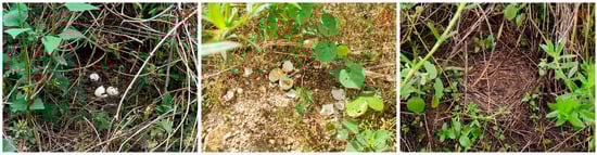 During the breeding season of 2021, 2023, 2024, and 2025, we discovered a total of 22 Chinese francolin natural nests across the two study sites (Table 1). Among them, 6 nests were reproductively successful (Figure 6), giving a reproductive success rate of 27.27%; and 16 nests were failed, of these, abandoned nests accounted for 93.75% of the failed nests, and all of the failed nests ended up being preyed upon. In addition, 16 nests were found in Datian Reserve (Figure 7) and 6 nests in Bangxi Reserve (Figure 8). The nest predation rate of the Chinese francolin was higher in Datian Reserve compared to Banxi Reserve, but the difference was not significant (81.25% vs. 50.00%, Fisher’s exact test, p = 0.283).