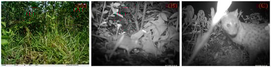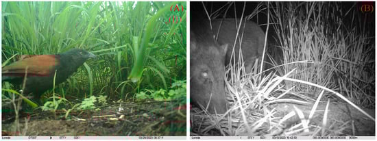 In the artificial egg experiments, three predation events were captured using infrared cameras, including one avian predator (greater coucal, Centropus sinensis) (Figure 11A) and two mammalian predators (small Indian civet; and wild boar, Sus scrofa) (Figure 11B), all of which were captured in Datian Reserve. In addition, other visiting animals were photographed, including the Hainan Eld’s deer, Hainan hare (Lepus hainanus), and Chinese francolin in Datian Reserve, and the Hainan Eld’s deer and a few rodents in Bangxi Reserve (Figure 12).