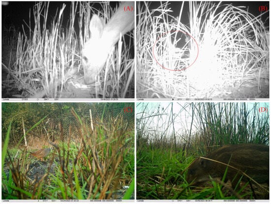 Visitors near artificial nests: (A) Hainan Eld’s deer; (B) Hainan Hare (the red circle indicates); (C) Chinese francolin; (D) wild boar cub.