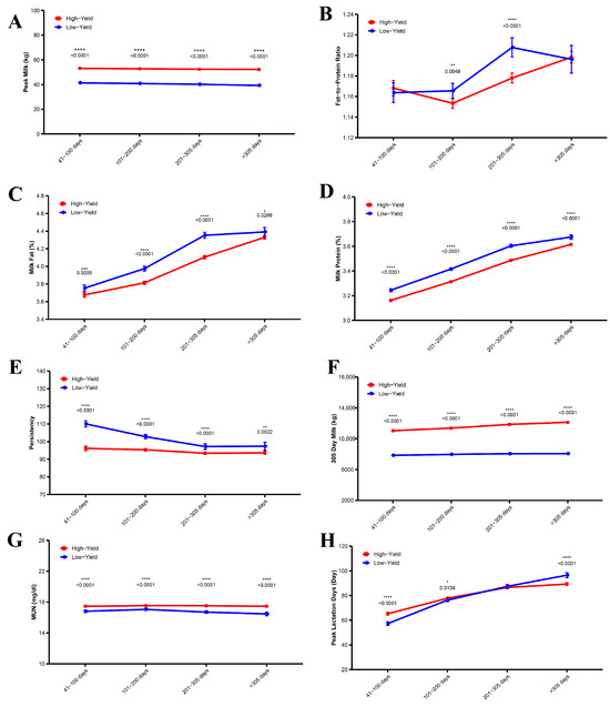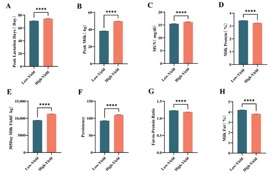 Differences in lactation performance and lactation days between high and low yielding cows. (A) Peak Milk, (B) Fat-to-Protein Ratio, (C) Milk Fat, (D) Milk Protein, (E) Persistency, (F) 305-Day Milk, (G) Milk Urea Nitrogen, (H) Peak Lactation Days. The significance of the difference is expressed as * p < 0.05, ** p < 0.01, *** p < 0.001, **** p < 0.0001.