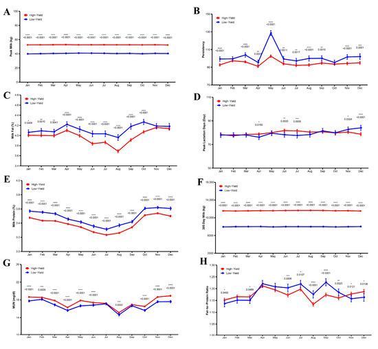 Monthly differences in lactation performance between high and low milk production cows. (A) Peak Milk, (B) Persistency, (C) Milk Fat, (D) Peak Lactation Days, (E) Milk Protein, (F) 305-Day Milk, (G) Milk Urea Nitrogen, and (H) Fat-to-Protein Ratio. Significant differences are indicated as * p < 0.05, ** p < 0.01, *** p < 0.001, **** p < 0.0001.