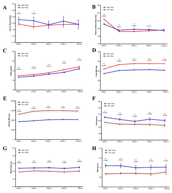 Differences in lactation performance and parity between high and low milk production cows. (A) Fat-to-Protein Ratio, (B) Peak Lactation Days, (C) Milk Urea Nitrogen, (D) Peak Milk, (E) 305-Day Milk, (F) Persistency, (G) Milk Protein, and (H) Milk Fat. Significant differences are indicated as * p < 0.05, ** p < 0.01, *** p < 0.001, **** p < 0.0001.