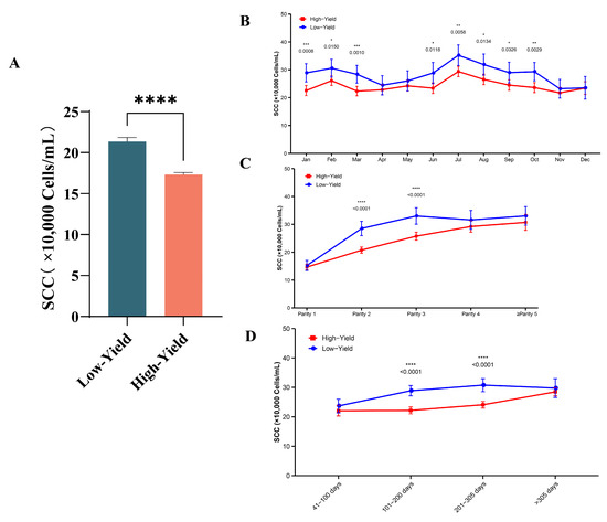 Differences in somatic cells between high and low milk yield cows. (A) SCC levels between groups, (B) SCC month differences, (C) SCC utilization differences in parity, (D) SCC differences in lactation days. Significance of differences are indicated as * p < 0.05, ** p < 0.01, *** p < 0.001, **** p < 0.0001.