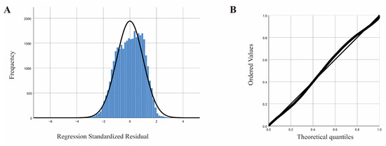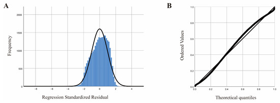Regression model; (A) standardized residual histogram; (B) standardized residual normal P-P plot.