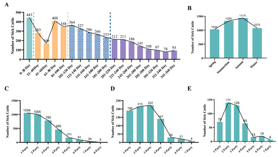 Analysis of the incidence of clinical mastitis in dairy cows. (A) Statistics of dairy cows with clinical mastitis during lactation days. (B) Statistics of dairy cows with clinical mastitis in different seasons. (C) Statistics of the parity of dairy cows with one clinical mastitis during lactation. (D) Statistics of the parity of dairy cows with two clinical mastitis during lactation. (E) Statistics of the parity of dairy cows with three or more clinical mastitis during lactation.