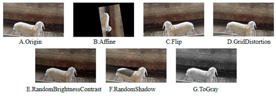 In the research and application of image data augmentation, using various transformation strategies to enhance the original images has become an effective way to improve the performance of deep learning models. In this study, a probabilistically controlled hybrid augmentation strategy was adopted, and a hierarchical random augmentation pipeline was constructed using the Albumentations framework. This simulated the potential diversity of perspectives, environmental noise, image distortion, and dynamic occlusion that may occur in the complex scenarios of actual Hu sheep farming. The goal was to enhance the diversity of the Hu sheep face dataset and the model’s generalization ability. The specific augmentation methods included affine transformations, flipping, grid distortion, random brightness and contrast adjustments, adding shadows, and grayscale conversion. Figure 4 shows the effects of different data augmentation strategies.