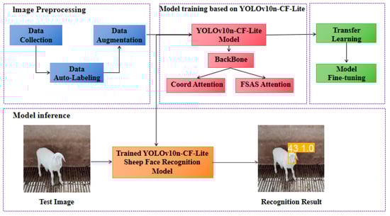 This study proposes a Hu sheep individual face recognition method based on automatic labeling and transfer learning, with the overall workflow shown in Figure 6. To build a high-quality Hu sheep face recognition model, the research involved multi-angle video collection and data augmentation techniques to expand the dataset, ensuring that the model could obtain rich and representative data. An automatic labeling algorithm based on sheep face detection was designed, significantly reducing the labeling time cost. Through automatic labeling, manual intervention was minimized, and high-quality labeled data were provided for subsequent model training. Furthermore, a Hu sheep face recognition algorithm based on YOLOv10n-CF-Lite was proposed. Compared to traditional YOLO models, it offers higher computational efficiency and a lighter network structure, making it particularly suitable for complex farming environments. In addition, this study employed a transfer learning strategy to improve the model’s adaptability and generalization ability to newly introduced sheep. Furthermore, a Hu sheep face recognition algorithm based on YOLOv10n-CF-Lite was proposed. Compared to traditional YOLO models, it offers higher computational efficiency and a lighter network structure, making it particularly suitable for complex farming environments. In addition, this study employed a transfer learning strategy to improve the model’s adaptability and generalization ability to newly introduced sheep.