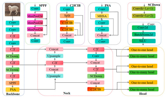 YOLOv10 is an efficient and lightweight object detection model, with its network structure shown in Figure 7. This model is an improvement based on YOLOv8, integrating depth-wise separable convolution, a lightweight network structure, feature fusion techniques, and an optimized detection head, aiming to provide fast and accurate object detection performance. The YOLOv10 network structure is primarily composed of three parts: Backbone, Head, and Neck. The Backbone extracts image features; the Neck performs multi-scale feature fusion through techniques such as feature pyramids; and the Head completes tasks such as classification, localization, and confidence prediction for object detection. The collaboration of these three components enables YOLOv10 to achieve efficient and precise object detection [29]. Considering the need for model efficiency and lightweight design in large-scale farming environments for Hu sheep individual recognition tasks, this study selects YOLOv10n as the baseline model to conduct research on Hu sheep face recognition.
