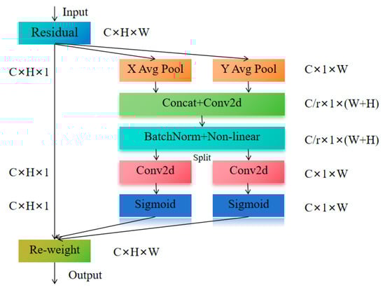 The PSA module emphasizes features at different positions by calculating position-sensitive attention weights for each position. However, this position-based attention mechanism increases computational complexity, especially in high-resolution images, which may lead to a decrease in inference speed. Moreover, in some tasks, the PSA module’s overemphasis on position information may neglect other, more useful features, thus affecting model performance. To address the computational complexity issue of the PSA module in high-resolution image processing, we propose replacing PSA with Coordinate Attention (CA). CA explicitly incorporates spatial coordinate information and combines it with channel features for weighting, optimizing the model’s ability to perceive spatial structural information, as shown in Figure 10. Compared to PSA, Coordinate Attention can focus on important spatial location information in a more streamlined manner, thus enhancing the spatial response capability of the features. This optimization of spatial information is achieved with lower computational overhead, enabling the network to efficiently process high-resolution images while avoiding the additional computational burden introduced by PSA.