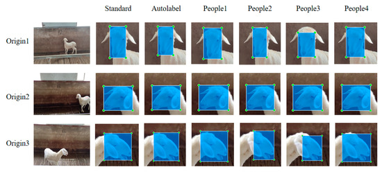 To verify the effectiveness of the proposed automatic labeling model, a comparative experiment was designed. In the experiment, a standard labeled dataset was selected, and the results of automatic labeling and four manual annotators were compared with the standard labeled results. The comparison of the sheep face region annotations is shown in Figure 12.