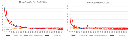 As shown in the table, after transfer learning, the YOLOv10n-CF-Lite model achieved a recognition precision of 92.7%, mAP@0.5 of 95.2%, and an F1 score of 91.0% on the target dataset, which represents a significant improvement in Hu sheep face recognition precision compared to the model without pre-training. This indicates that, despite the relatively small size of the target dataset, transfer learning can effectively help the model adapt to new data and significantly accelerate the fitting speed of features during training, as shown in Figure 14. When the best weights from the source dataset were not used for pre-training, YOLOv10n-CF-Lite required 43 epochs of training to achieve relatively good performance. However, when transfer learning was applied to the target dataset, precision exceeded 90% after just 14 epochs of training, significantly improving the model’s convergence speed. Furthermore, the transfer learning model’s validation loss decreased more rapidly and maintained lower losses on both the training and validation sets, demonstrating better generalization ability.