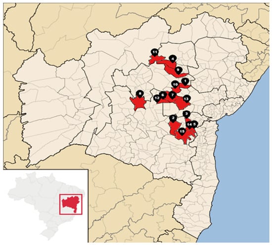 Map of the State of Bahia, Northeastern Brazil, highlighting in red the 13 municipalities where the 15 outbreaks of chronic edema disease in cattle occurred. The outbreaks studied occurred in the municipalities of Mairi (1), Maracás (2), Irajuba (3), Mirangaba (4), Jaguaquara (5), Lajedinho (6), Ruy Barbosa (7), and Seabra (8), while the reported outbreaks occurred in Jacobina (9), Mundo Novo (10), Umburanas (11), Lajedinho (12), Itaberaba (13), Jaguaquara (14), and Jequié (15).