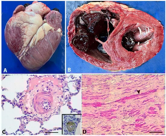 Postmortem examinations were performed on seven animals. Gross lesions, present in all animals, included subcutaneous edema, particularly in the thorax, dewlap, and facial regions; and hydrothorax, hydropericardium, ascites, cachexia, and pallor of the mucous membranes and organs. Hydrothorax was the most pronounced effusion encountered. Edema of the abomasum and small intestine, mainly in the duodenum, was also observed. Pulmonary lesions consisted of pulmonary edema with interlobular septal thickening. Cardiac findings included right ventricular dilatation (Figure 3A,B). Serous fat atrophy was observed in some animals. The livers were moderately enlarged, with rounded edges and dark red or yellowish coloration. An accentuated lobular pattern (nutmeg appearance) was observed in four animals. The kidneys appeared normal, except for some pallor or redness.