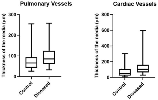 Boxplots showing the thickness of pulmonary (left) and cardiac (right) arterioles and arteries of affected and unaffected cattle. In both organs, the thicknesses of the media of affected animals are significantly greater (p < 0.05) than those of unaffected control animals.