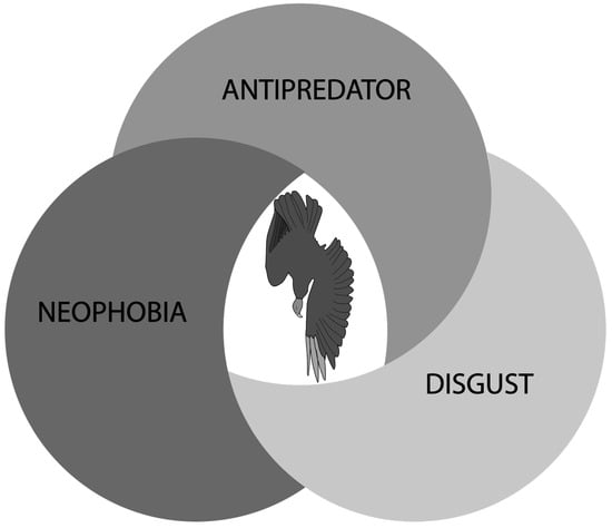 That avoidance behavior can result from disgust is compelling, as fear can also be elicited as result of antipredator behavior or neophobia, as discussed above. However, disgust, like neophobia, is rarely contemplated as a driver of fear resulting from exposure to a deterrent. For example, methyl anthranilate, a chemical repellent, has been tested for and employed as a tool for reducing human–wildlife conflict [,,]. As a chemical repellent/irritant, the efficacy of methyl anthranilate is contingent upon an animal’s reaction following initial exposure []. That is, the disgust for the chemical repellent (and accompanying behavioral response) likely occurs by way of post-ingestive feedback [] following initial or subsequent exposure. Clearly, there lies the potential for several alternative mechanistic underpinnings responsible for driving fear in an animal when exposed to deterrents or repellents.