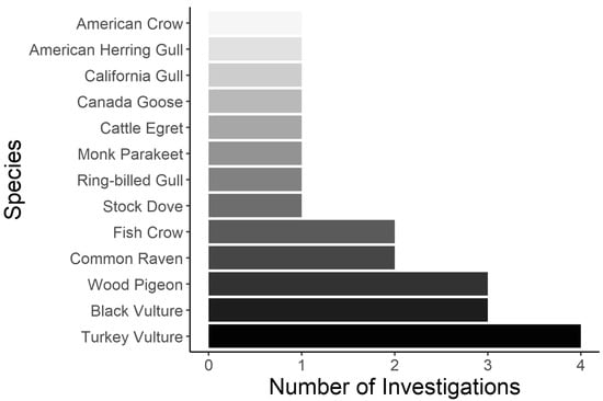 All effigy investigations were focused on social birds, with turkey vulture and black vulture (Coragyps atratus) being the most studied species (Figure 2). However, most of these vulture works lacked experimentation and statistical validation (Table 2), which means that caution is warranted when interpreting their findings and inference. Turkey and black vultures are known to utilize several roosts in a season, rotating amongst them independent of disturbance [,]. Effigy investigations that focus on one or few roosts may observe changes in vulture site attendance because of normal roost-switching behavior rather than effigy deployment, underscoring the need for ample replication across multiple populations of vultures and roost networks when investigating effigies. We speculate that social avian species are more frequently studied in effigy research compared to solitary species because the magnitude of human–wildlife conflict with social species is greater than with solitary species. When considering that only thirteen species were included in the review, there remains ample opportunity for effigy investigations on other social birds. For example, several species of crane regularly come into conflict with humans [], and given their highly social nature, there is plausibility in testing hypotheses pertaining to the influence of effigies on their behavior.