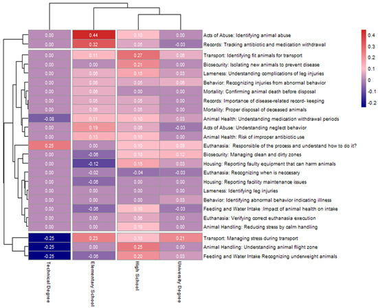 A topic heatmap (Figure 3) revealed that livestock workers with an elementary school background exhibited the most substantial knowledge gains in key areas such as identifying acts of abuse (+0.44), record keeping for antibiotics (+0.32), and managing stress during transport (+0.23). These results suggest that the training effectively addressed foundational knowledge gaps among participants at lower levels of education. Participants with high school and university-level education showed moderate improvement across a broader range of topics, including biosecurity, animal health, and transport management. This suggests that while they may have entered the training with greater baseline knowledge, the content still reinforces their understanding of animal welfare topics. In contrast, livestock workers with technical degrees showed minor negative differences across multiple topics. These included areas related to stress management during transport, animal handling, and identification of underweight animals. The clustering structure in the heatmap grouped similar knowledge gain patterns across education levels. Topics such as euthanasia procedures, biosecurity, and transport appeared in closely aligned clusters, indicating consistent performance across groups. Meanwhile, areas showing minimal or negative change among technical degree holders also clustered together.